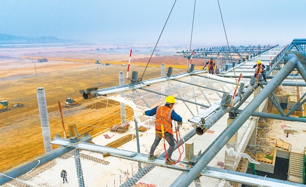2021年1月5日,鄂州花湖机场航站楼施工现场,工人抢抓工期施工。