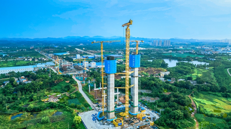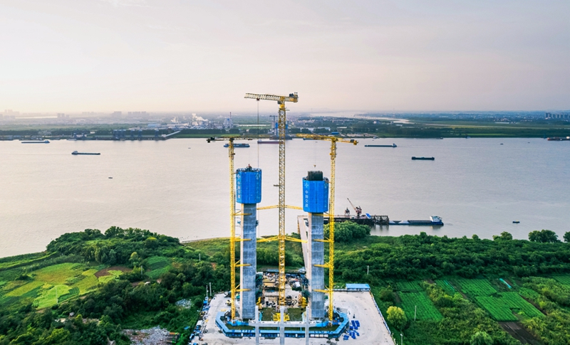 燕矶长江大桥为世界首座不同垂度四主缆钢桁梁悬索桥,大桥全长26.1公里,主桥长1860米,主塔为城墙门楼造型门形框架结构,塔高184米,共分35个节段进行施工,起步段和塔顶段采用翻模法施工,标准段采用一体化筑塔机施工,目前上游侧塔柱已施工完成第19节段。
