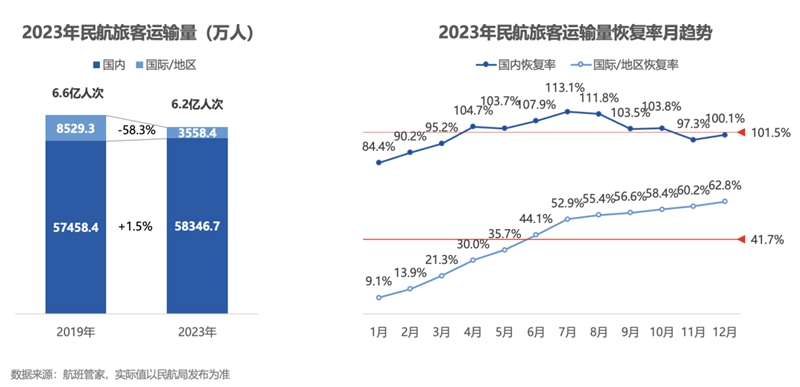 2023年实现运输航空飞行安全年,全行业完成旅客运输量6.2亿人次,比上年增长1.5倍,恢复到2019年同期的94%。从变化趋势看,自2月旅客运输量突破4000万人次之后,3月民航国内运力投放超过2019年同期的6%,3月旅客运输量达到4570万人次,恢复到2019年同期的84%。二季度,随着我国经济稳步复苏,加上出入境政策调整优化,民众出行意愿持续增强,航空运输市场继续保持快速回升态势,4月份民航客运量突破5000万人次,国内客运量超过疫情前同期;5月份再创新高,达到5170万人次。三季度迎来暑运旺季,启动早、启动快,暑运运输旅客1.3亿人次,超过疫情前水平,同比2019年增长7.4%。四季度航空客运进入淡季,市场需求有所回落。国际客运持续恢复,国际客运航班从年初的每周不到500班,恢复到年底4600余班,增长9.6倍,复航国家数量达到疫情前89.2%。国际客运量从年初的不到100万人次/月,恢复到300万人次/月以上,全年达到2800万人次以上,同比增长14倍。随着我国对外免签政策以及一系列出入境便利化政策措施出台,国际客运市场将持续加快恢复。