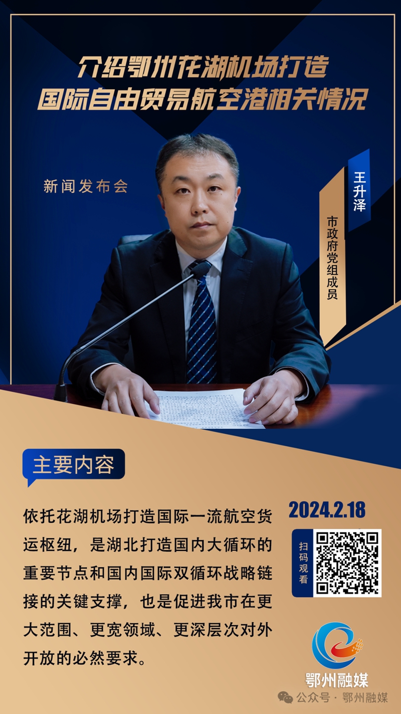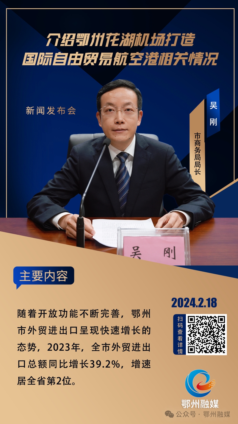 2024年1月,国家口岸办下文批复,同意湖北省“以花湖机场智慧口岸试点建设为起步,统筹做好全省智慧口岸建设”,并由国口办指导。随着开放功能不断完善,鄂州市外贸进出口呈现快速增长的态势,2023年,全市外贸进出口总额同比增长39.2%,增速居全省第2位。
